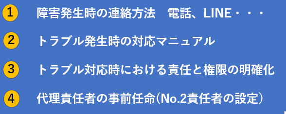 突発的なトラブル発生時には頭が真っ白になる可能性がありますので「トラブル対応マニュアル」を平時から準備し定期的に訓練し内容の充実を図っておくことも大切です