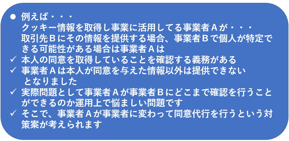 提供元事業者は提供先事業者で個人を特定して使う可能性がある場合は提供先が個人に対して同意を取得しているか確認し