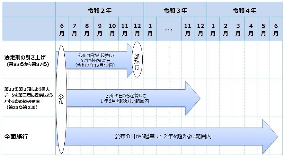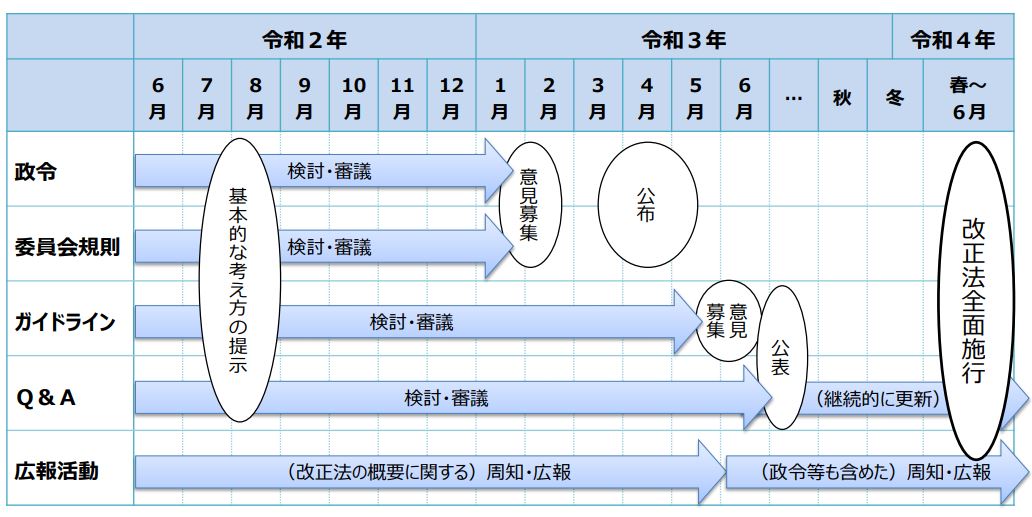 | 2020/10/6 | 個人情報保護委員会より2020/10/01に個人情報保護法施行日などについて以下のようなスケジュールが表明されました。 三段階で施行されるようです 第一段階は法定刑の引き上げが2020年12月まで一部施行されます 個人情報保護委員会命令違反が個人では30万円以下から100万円以下に法人が同じく30万円以下から1億円以下にまた個人データーベースなどの不正提供なども法人については50万円以下から1億円以下に実効性のある罰金へ引き上げられています 第二段階は個人データを第三者に提供しようとする経過処置として公布の日から18か月を超えない日となりました 第三段階は全面施行で公布から2年を超えない範囲となっています また7月22日には「改正個人情報保護法の基本的な考え方」も決定されました https://www.ppc.go.jp/files/pdf/200722_kihontekikangae.pdf この中で第三者提供の記録の開示や新設された仮名加工情報について及び提供先における個人データの取扱など目新しい内容が含まれています。 今後のガイドラインや政令の改正情報に注目されて下さい 今後のロードマップによると 政令は来年4月公布予定、ガイドラインは来援6月以降が予定されているようです 詳細は個人情報保護委員会のページをご確認ください https://www.ppc.go.jp/personalinfo/legal/kaiseihogohou/ 個人情報保護委員会情報より 個人情報保護委員会情報より |