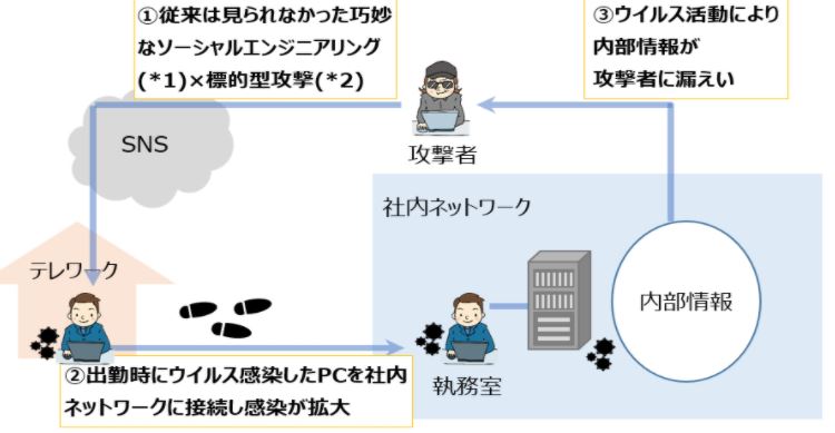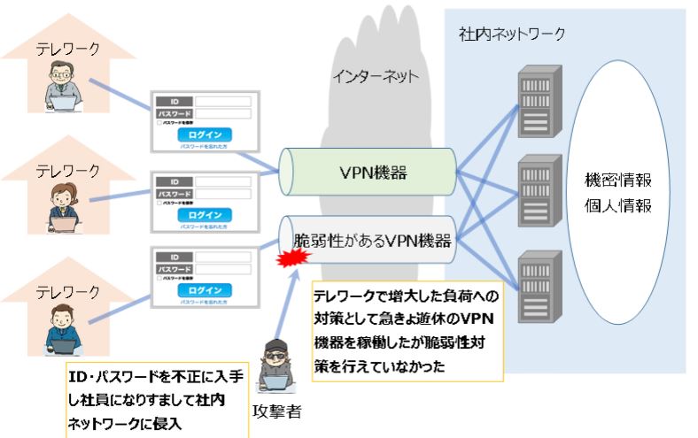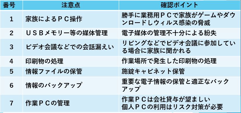 | 2020/10/12 個人情報保護委員会よりテレワークにおける事故事例が紹介されています 日常的にテレワークを利用している企業が増えてきました 個人情報委員会よりテレワークにおける事故事例が紹介されていますので自社でも発生のリスクについて検討され必要な対策を取られて下さい テレワークを利用する上で注意を怠れば事故当時者に誰でもなりうる事例と言えるでしょう ⇒ 個人情報保護委員会からの注意事項の詳細はこちらから (事例1) テレワークで自宅作業の合間にSNSなどで知り合った第三者からウィルスが送られそれに気づかず感染し、感染したPCを会社に持ち込み社内に感染が広がった事例 (個人情報保護委員会情報より) 作業で利用しているPCでプライベートな取り扱いは行わないルールと徹底が必要です VPNなどで企業との通信セキュリティ確保は行われているので安心していると想定外のルートから侵入される恐れがあります 業務PCでは業務以外では利用しない、怪しいホームページにはアクセスしないなどの基本動作が求められます (事例2) テレワークのネットワーク環境を整備するときに機材が不足しており旧型のVPN機能があるルータを設置したが旧型で脆弱性を持っていることを調査しておらず、その脆弱性を突いて外部から不正アクセスが行われ社内情報が漏えいした (個人情報保護委員会情報より) VPN=安全という固定概念をもつことは大変危険です 使っている機材によりセキュリティの脆弱性を抱えている機材があります 安いから、昔から使っていたからなどは機器選定の理由にはなりません 少し古いけれど中古ショップで格安で見つけたのでラッキー!ではありませんヨ!? セキュリティ確保に手抜き(コスト重視等)は禁物です 出来るだけ最新の機材(高ければ良い訳でもありません)を使い基本的なセキュリティ条件は確保しましょう 当然ですがメーカが設定したデフォルトのIDやパスワードはご法度です VPNの仕組みのお話はまた別の機会に・・・ 参考に弊社でテレワーク研修で使っているテレワーク注意点資料(抜粋)を掲示します テレワークを行う上での確認チェックにお使いいただければ幸いです (isec-lab セミナー資料より) |